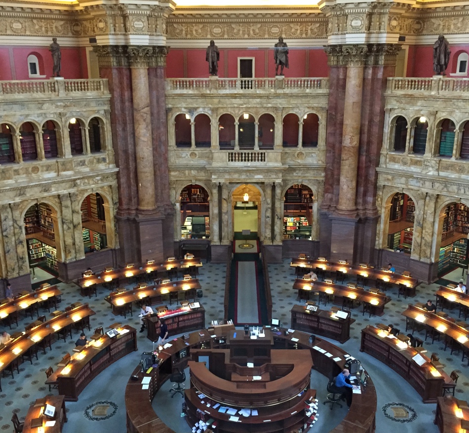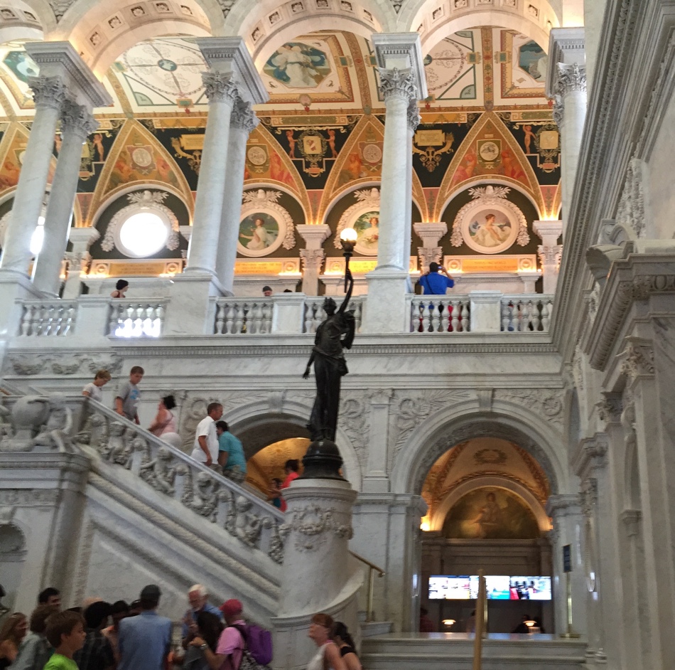 In summer 2015, I visited the USA and part of Canada. It was seven weeks of hectic fun. In Washington, one of the highlights was a visit to the Library of Congress, specifically the Jefferson Building. It was ‘all kinds of awesome’: the magnificent colourful entrance hall and sumptuous steps, Jefferson’s book collection, an original Gutenberg Bible, the incredible reading room which reminded me of my days using the British Library although the two buildings couldn’t be more different.