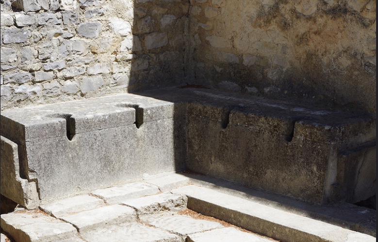 The Roman loos! Here I learnt that ‘taking your ease’ was a social event. I was shocked by this at fourteen years old. (We were more innocent then at that age.) But it demonstrated to me just how differently Romans saw and did things. The 4-seat latrine from ‘Maison la Tunnelle’ built in the 2nd century AD. Running water in the channel beneath the seats constantly ‘flushed’ the latrines. Photo: Creative Commons