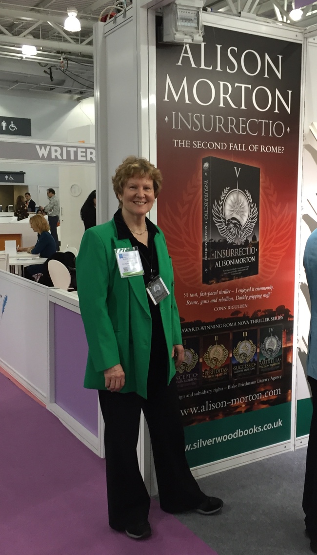 INSURRECTIO, the fifth Roma Nova thriller, was due to be launched on the Tuesday, so clad in my 1980s green ‘networking jacket’ – the book is set in the 1980s – I headed to the SilverWood Books stand. As I approached it, my name and INSURRECTIO in large Roman letters blasted out at me. What a great panel SilverWood Books had done for me!