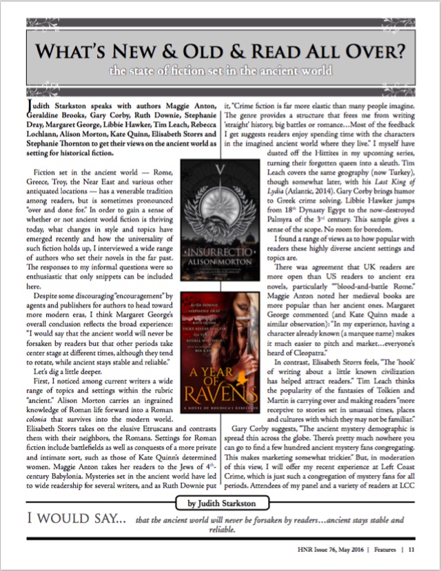 I was delighted to receive the quarterly jewel, the Historical Novel Review, May 2016 edition, published by the Historical Novel Society. Even more delighted as my writing friend Judith Starkston had written a terrific article about ancient world themed historical fiction.