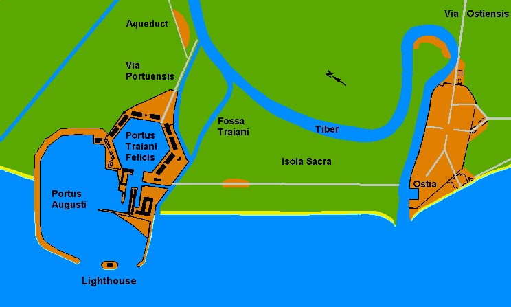 Two curving moles were built out into the sea. Between the moles, on an island formed by sinking a large merchantman, a four-storied lighthouse was built. This harbour became silted up and around about 110 AD the emperor Trajan enlarged the new harbour with a huge land-locked inner hexagonal basin still visible today. Its form was hexagonal in order to reduce the erosive forces of the waves. The harbours were connected with the Tiber by canals.