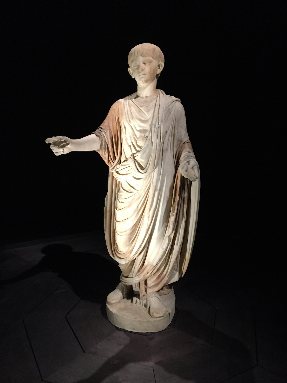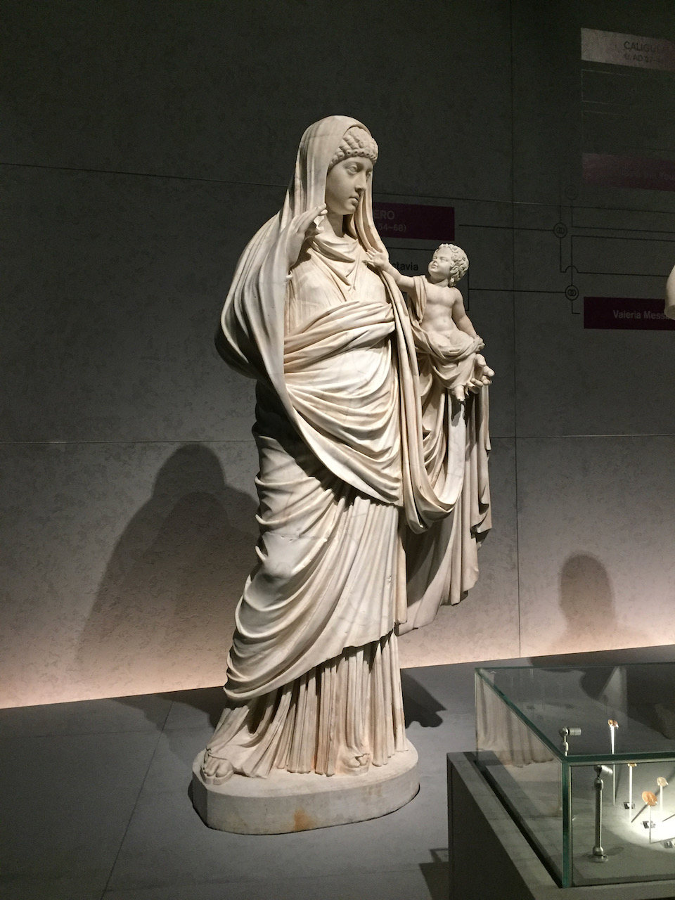This exhibition questioned all that and drew deep on the sources to reassess Nero and his actions in context. It wasn’t a whitewash, just a re-examination. Many visitors may not have been aware of the strong influence of Agrippina, Nero’s mother, on the very young emperor, or of the fact that Nero wasn’t in Rome at the time of the Great Fire in 64 CE*. As well as referencing great events such as the Boudiccan Revolt, war with the Parthians, the Great Fire, exhibits included scenes from Roman life as they applied to Nero’s time and reflecting his interests – building and arts, especially the theatre.