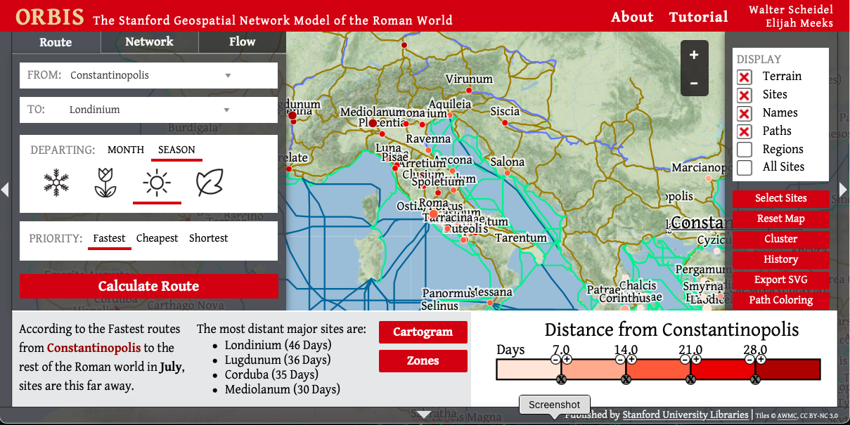 When you want to find out how long it takes to get from A to B, whether by walking, ship or ox-cart, there’s the ever reliable interactive ORBIS from Stanford University.