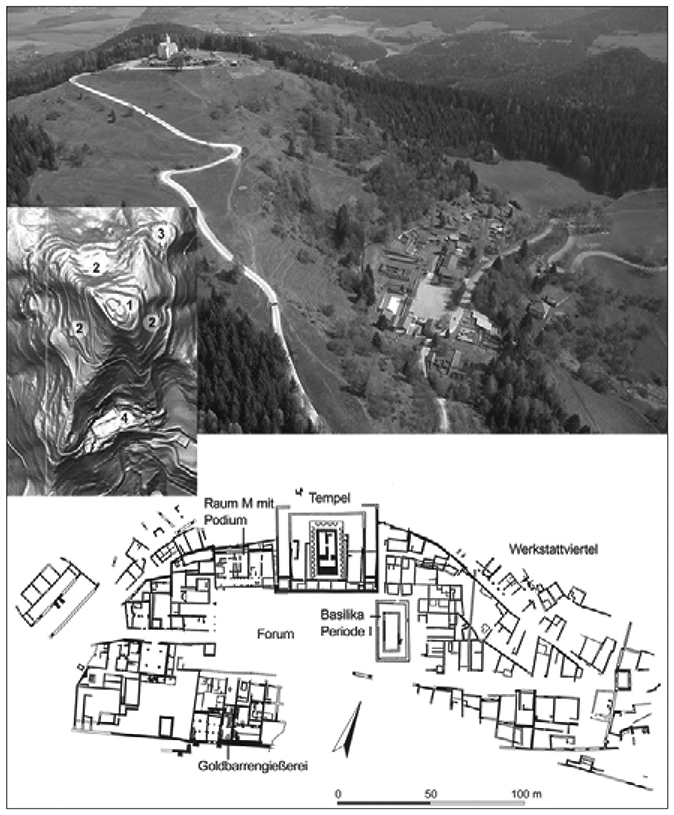 Aerial view of the Magdalensberg from the southwest, with a laser scan marked with early buildings (1. summit fortification 2. main wall 3.curtain wall 4. early Roman town) and street map*