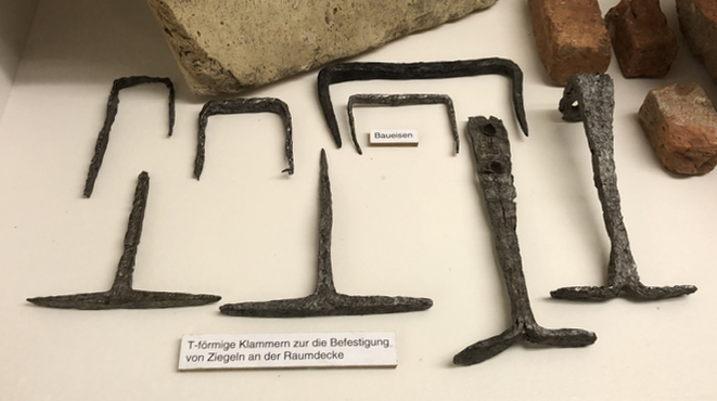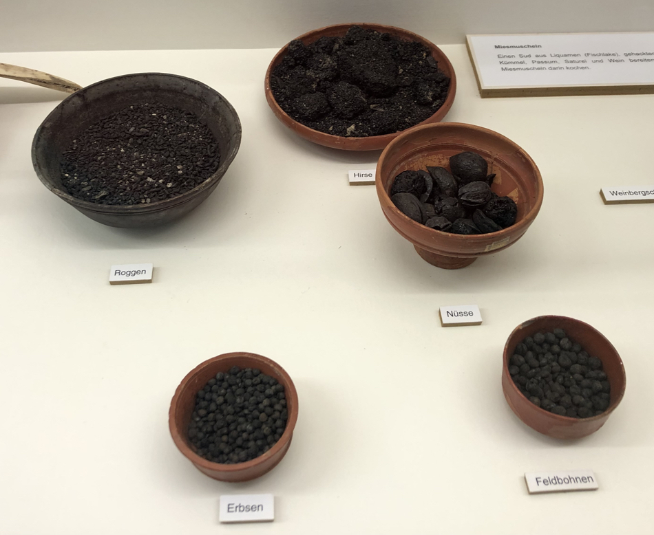 Food remains from Magdalensberg: Horse – millet, Roggen – rye, Nüsse – hazelnuts, Erbsen – peas, Feldbohnen – fava beans. Also snails and oysters (not shown)