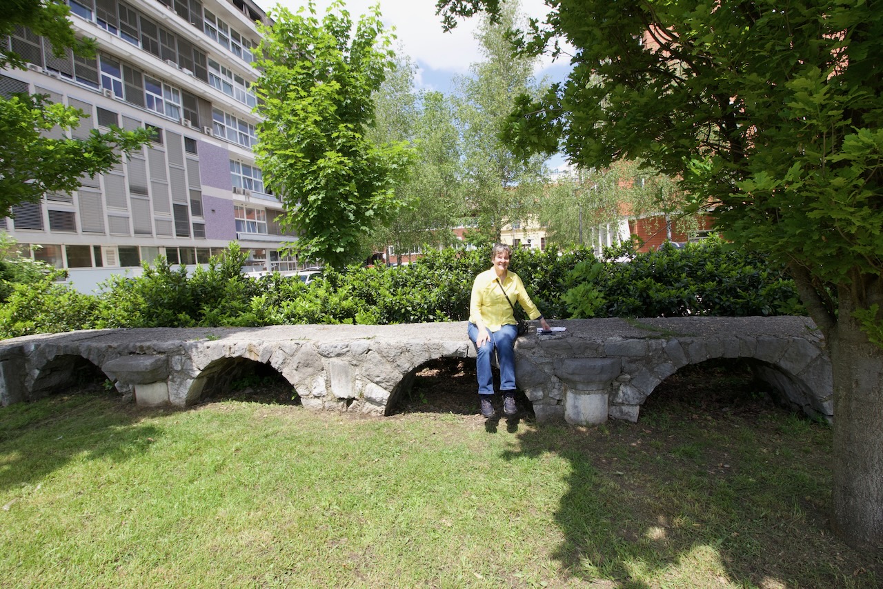 We received the distinct impression that Ljubljana, although a forward looking and modern European city, is proud of its Roman history. The Roman heritage is very honoured and the city museum finds are imaginatively displayed. A lot has been developed from what there is available and the supporting research is serious and well done; digs are now organised in the modern way. But a number of the existing monuments, especially by the south wall were mucked about with in the 19th and 20th centuries, probably with the best of intentions. This series of arches where I’m sitting (above) was reconstructed from Roman rubble. However, it was a way of remembering and honouring a distant heritage and trying to recapture it after centuries of oblivion.