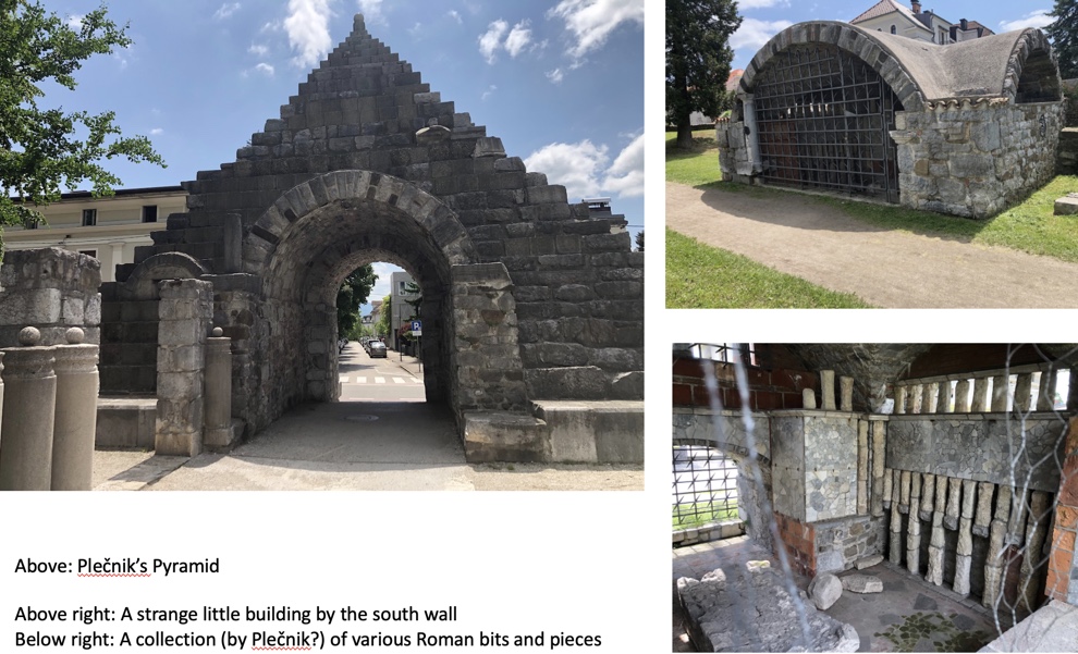 Many of his contemporary buildings are very impressive, but… He redesigned the remains of the Roman walls: he cut two new passages to create a link to Snežnik Street and Murnik Street, and behind the walls he arranged a park displaying architectural elements from Antiquity, with a stone monument collection in the Emona city gate. Above the passageway to Murnik Street he set up a pyramid, which he covered with turf.