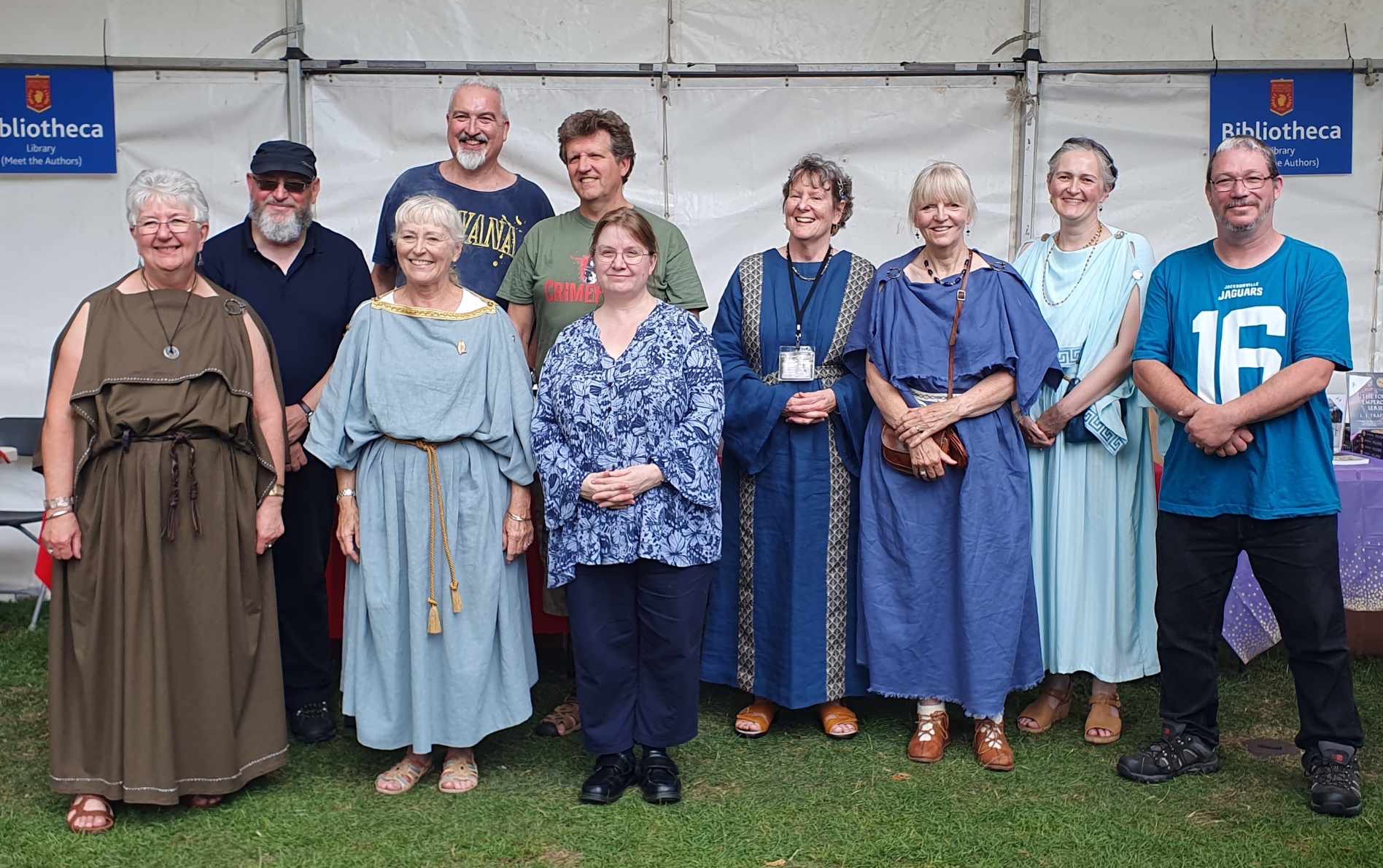 The Roman authors! Left to right: Nancy Jardine, Graham Sumner, Jacquie Rogers, Simon Elliot, Jason Monaghan, LJ Trafford, Alison Morton Ruth Downie, Kate Cunningham, Simon(SJA) Turney (Photo courtesy of Tracey Turney)