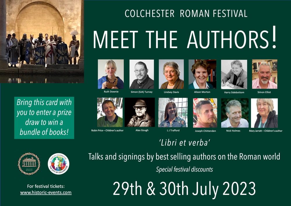 The ‘old crowd of authors – Simon Turney (S J A Turney), Ruth Downie, Alex Gough, Harry Sidebottom, L J Trafford, Mary Jarratt, Robin Price and I from last year were enhanced by historian, author and archaeologist Simon Elliot of the University of Kent plus Nick Holmes of The Fall of the Roman Empire podcast. But to our immense pleasure, our star fellow author was Lindsey Davis of Falco and Flavia Albia fame!
