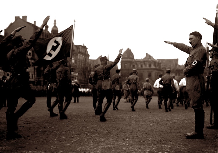 Nazi Party (NSDAP) leader Adolf Hitler saluting members of the Sturmabteilung in Brunswick, Lower Saxony, 1932.