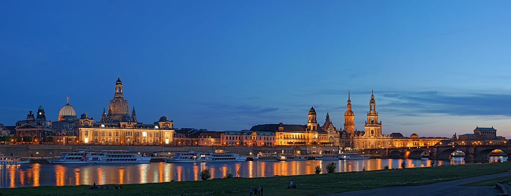 Dresden by night along the River Elbe Photo by Kolossos, CC BY 3.0 via Wikimedia Commons