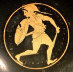 Armed Amazon, her shield decorates a Gorgon head; Tondo of Attic red-figure kylix, c. 500 BCE, Staatliche Antikensammlungen, Berlin (Public domain)
